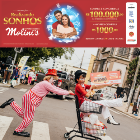 Lançamento da Promoção Realizando Sonhos Molini’s Supermercados, onde você concorre a R$100.000,00 em dinheiro em conta digital e mais 40 vales-compras de R$1.000,00 cada!